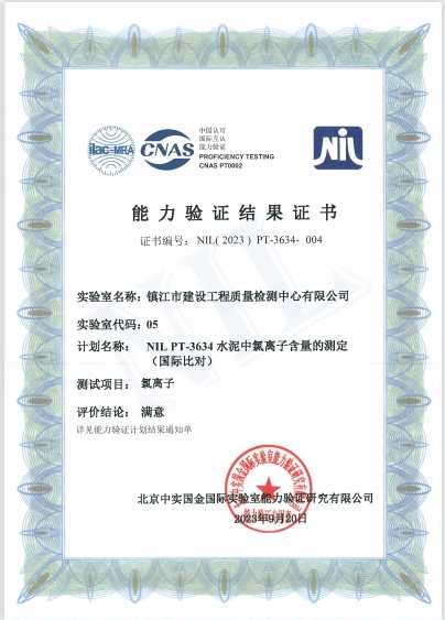 2023年9月份,检测中心参加了“NIL PT-3634水泥中氯离子含量的测定(国际比对)”能力验证,运用电位滴定的方法对水泥样品中的氯离子含量进行检测,提交的检测结果评价为“满意”,顺利通过此次能力验证。