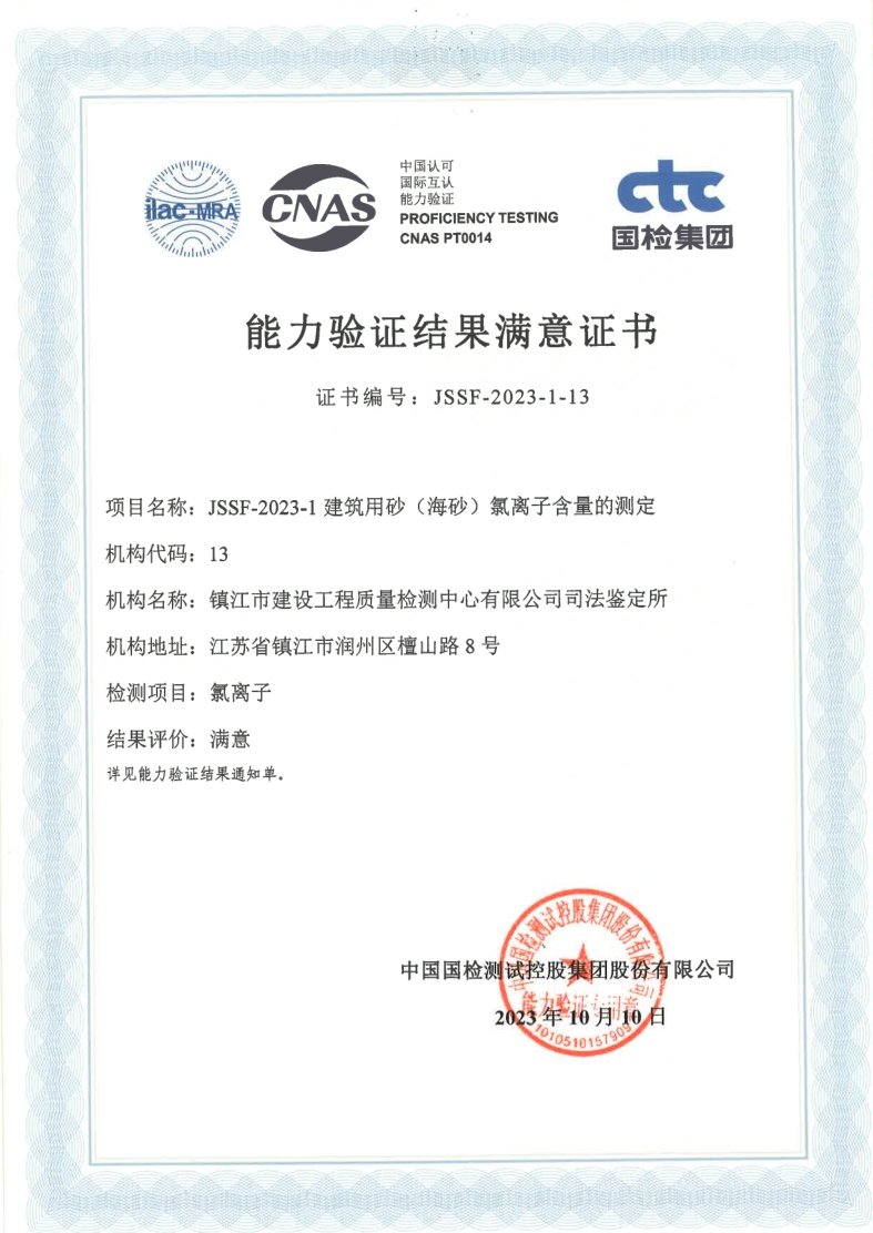 2023年9月份,检测中心参加了2023年度微量物证(建工类)司法鉴定能力验证活动“JSSF-2023-1建筑用砂(海砂)氯离子含量的测定”能力验证项目。本次能力验证由江苏省司法鉴定协会微量物证专委会组织,中国国检测试控股集团股份有限公司实施。近日,我中心收到评价结果,其结果为“满意”。