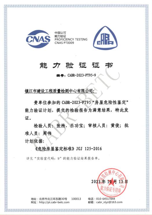 今年6月,检测中心参加了由CNAS组织实施的“危险房屋鉴定”能力验证并于近日收到评价结果,评价分数为96分,结果显示为“满意”。